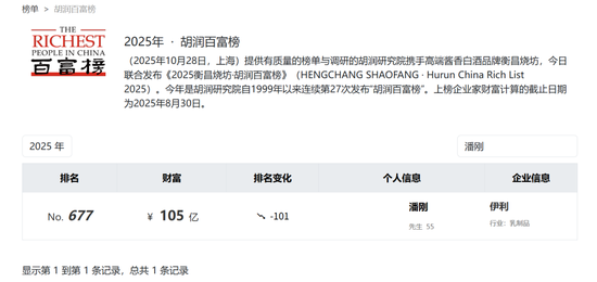 2025年胡润百富榜中,潘刚以105亿个人财富,排在第677位。